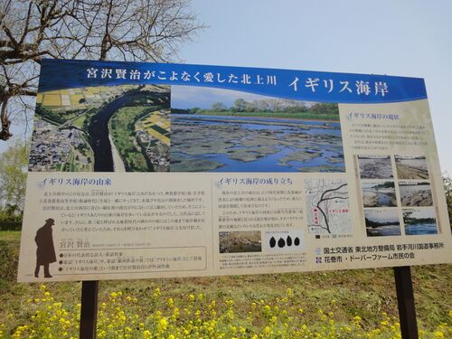 引き続き花巻の町中を周る。 続いてやってきたのはイギリス海岸 北上川と猿ヶ石川の合流地点よりやや南 イギリスの白亜の海岸を連想させることから賢治兄さんがイギリス海岸と名付け、足繁く通っていた場所である。 土手は桜並木となっている。 KJにとって…