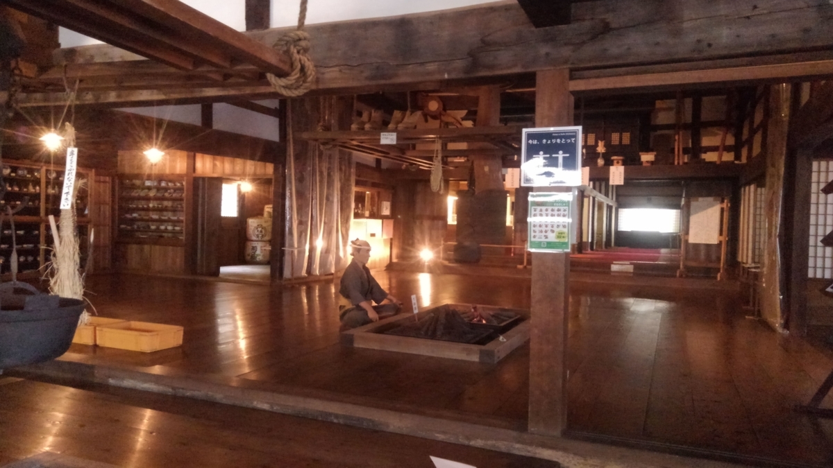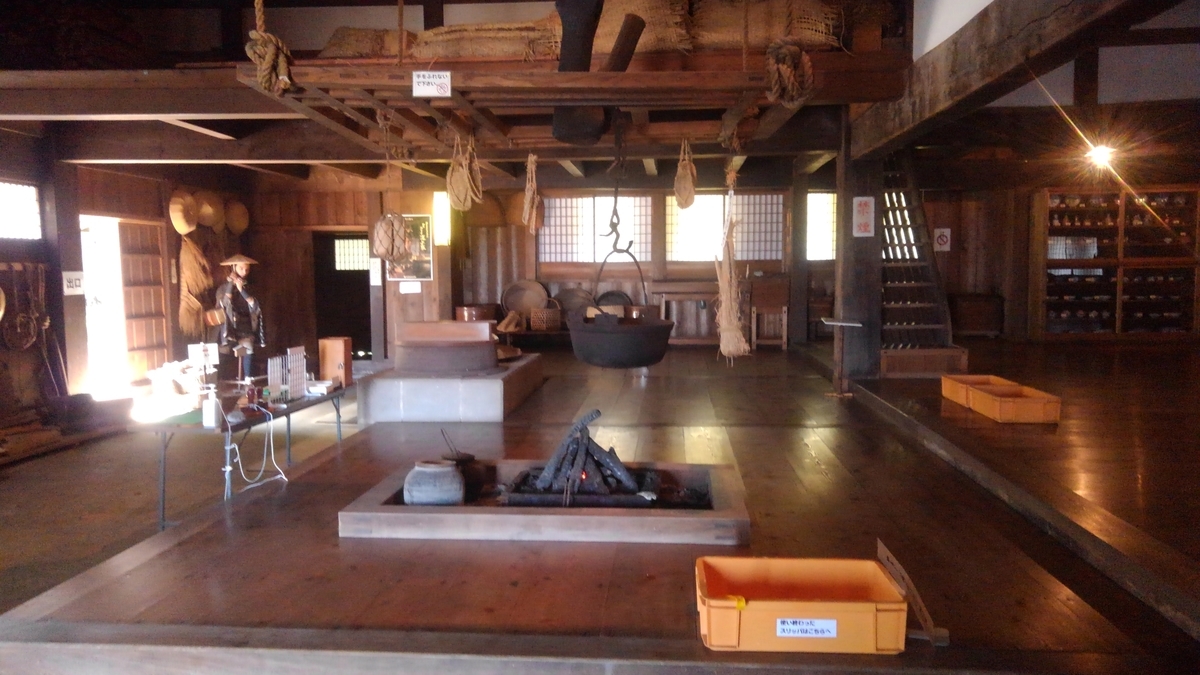 建物内部。部屋の中心に囲炉裏がある。