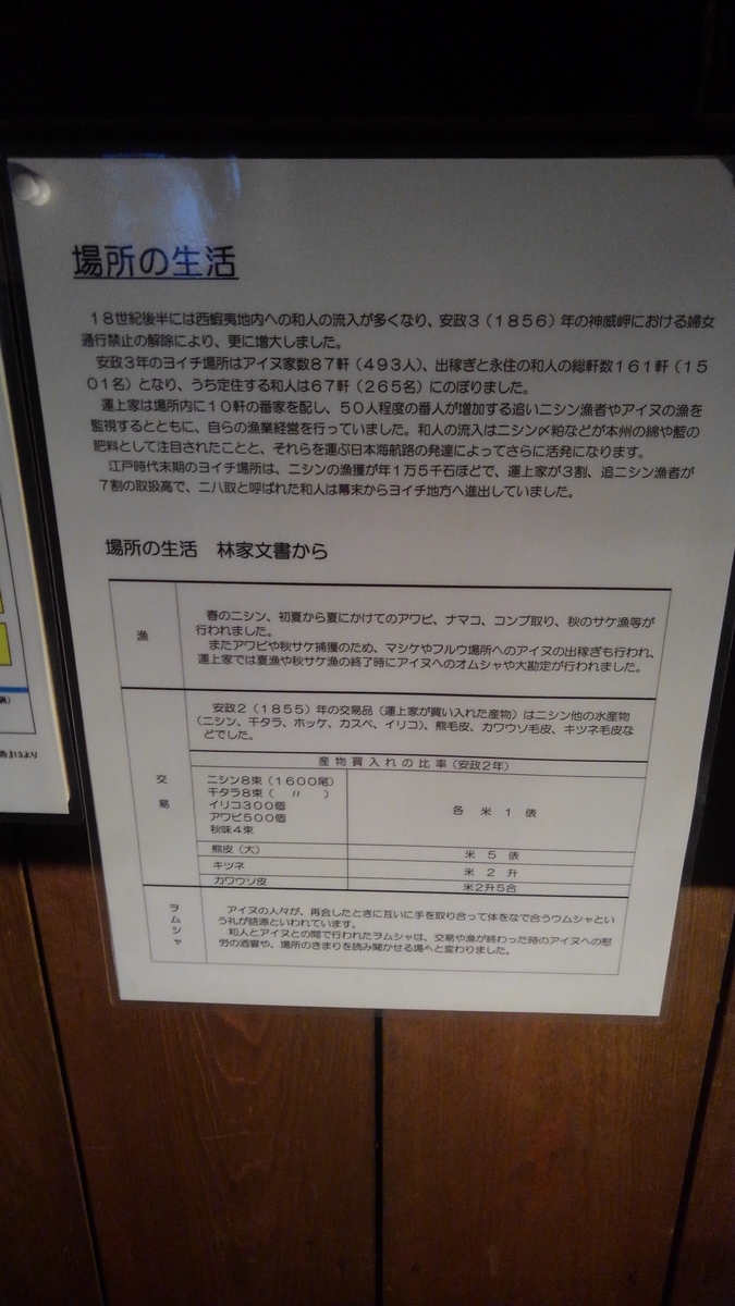 ヨイチ場所もその一つ。藩士たちは自身で本州からアイヌの欲する鉄製品などを仕入れ、海産物などと交換していた。しかし、所詮は武士の商法でなかなかうまくいかなかったようで借金漬けになる者もいたようだ。