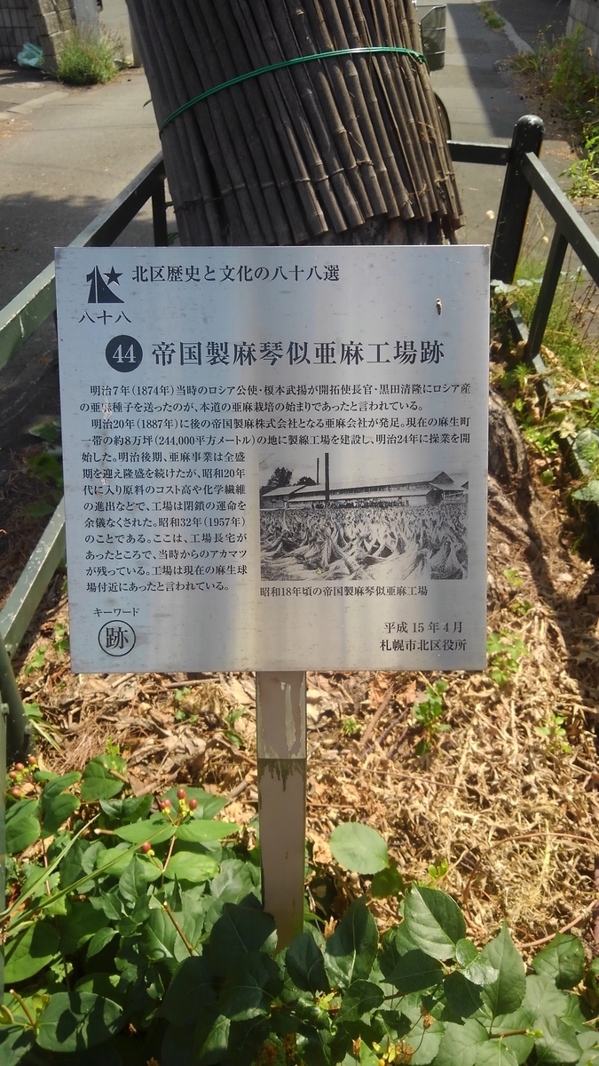 1887年北海道製麻株式会社が発足。1891年新琴似番外地であった現在の麻生地区に製線工場が建設。屯田兵たちも契約終了による官給打切後、勤務するようになる。