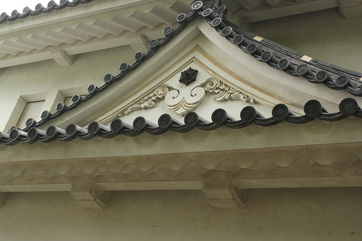 上下四方に屋根や庇(ひさし)を設けた入母屋造(いりもやづくり)、平瓦と丸瓦を組み合わせた本瓦葺き(ほんかわらぶき)。